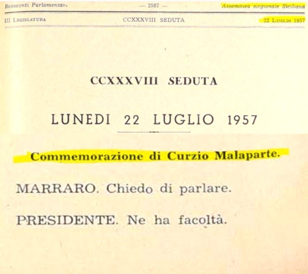 L’Assemblea Regionale Siciliana nella seduta del 22 luglio 1957 ricordò la morte di Curzio Malaparte, con vari interventi, il testo è molto lungo, alcuni stralci: