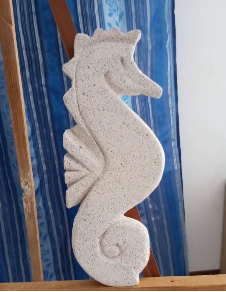 Propongo ai lettori del Notiziario alcune sue opere, tra cui “Cavalluccio Marino” in scultura su gasbeton (che è un composto di risorse naturali come acqua, sabbia, calce e cemento) e “Vulcano” opera su tavola olio e acrilico.