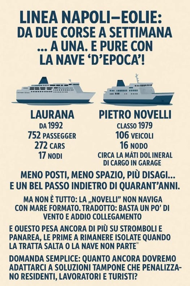 La preoccupazione maggiore in questo momento riguarda la linea strategica Eolie – Napoli. Anche per la stagione invernale in corso, la motonave "Laurana", dotata di adeguate capacità (158 cabine e 272 auto), è stata sostituita dalla "Pietro Novelli", un mezzo del 1979 che offre solo 18 cabine e circa 93 posti auto. Tale imbarcazione è del tutto inadeguata, anche per confort, velocità e tenuta del mare, a coprire una rotta statale che richiede oltre 15 ore di viaggio.