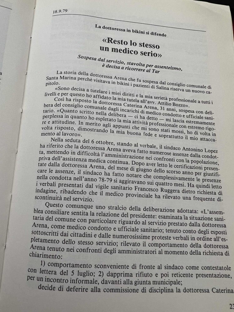 Finirà così sui giornali italiani per questo “scandalo”, imperdonabile ad una donna di quegli anni. (Le prime immagini sono foto di repertorio Shutterstock)». La storia però non finisce qui perché la dottoressa Arena «intraprende azione legale contro l'Asl e la vince. La sentenza risuonerà per tutta Italia: “Non è reato visitare in bikini”.