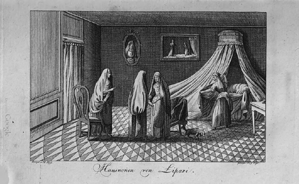 In particolare, “A Lipari ci sono due monasteri con regole diverse, ma nessun convento femminile. Ciononostante, ci sono molte giovani ragazze che si dedicano alla vita monastica, solo che non vengono rinchiuse. In questo caso, di solito rivelano i loro desideri al confessore e indossano l'abito delle monache scalze. Queste monache o Maturiane, rinunciano al voto di verginità perpetua e rimangono nella casa dei genitori, alla cui compagnia partecipano, come le altre donne della famiglia; anzi a causa del loro abbigliamento e del voto, a volte godono di una compagnia più libera delle altre. A noi francesi, questo stile di vita sembra un po' insolito; ma a un esame più attento, non è diverso...dalle vergini ai tempi della prima Chiesa, prima del V secolo, quando fu introdotto il chiostro. L'abito di queste religiose è molto meno sobrio che in altre regioni. Indossano abiti del colore prescritto dal loro ordine. Quella che ho disegnato indossava una tunica bianca e un mantello blu. Il suo scapolare era bianco e arrotondato in basso, come i Francescani di Santa Paola. La prima che ho visto era una donna alta e bella.