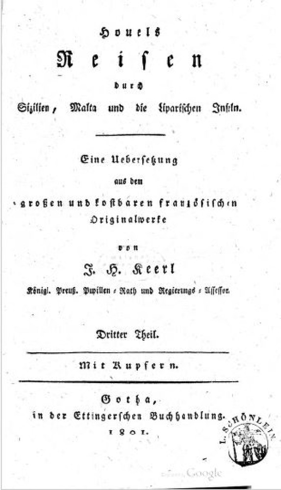 Poiché la cortesia richiedeva che andassi subito a trovare il sindaco, il barone d'Amico, suo figlio, il dottor Riccardo, e il signor Rodriguez mi accompagnarono lì, dove fummo accolti molto bene...Decisi di visitare tutte queste isole: non solo per cercare curiosi reperti dell'antichità, ma anche per raccogliere osservazioni utili alla storia naturale locale. Per prima cosa fui condotto al castello di Lipari, che sorge su una roccia sul versante orientale dell'isola. Un sentiero in leggera pendenza ci portò lì dalla città; tuttavia, ci sono diversi modi per raggiungere questo edificio. Il castello stesso appartiene alla città e il governatore vive in cima alla roccia; anche la guarnigione si trova qui, nella cittadella, e la chiesa principale fu costruita lì, proprio nel luogo in cui gli antichi avevano eretto il tempio del loro dio...