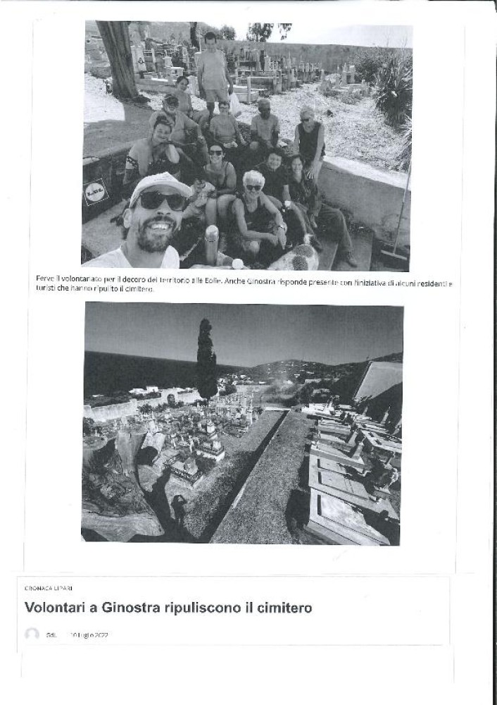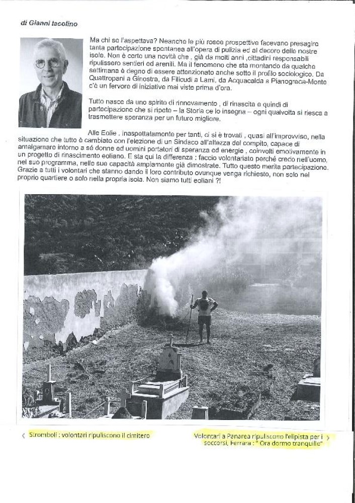 Si respira un’aria nuova. Fervono numerose forme di volontariato: volontari puliscono Piazza Mazzini; a Panarea volontari sistemano parte del basolato sul molo e ripuliscono l’elipista per i soccorsi, così dormo tranquillo dichiara Ferrara (non mi sembrava molto tranquillo nell’ultimo Consiglio Comunale); a Ginostra volontari puliscono il cimitero; a Stromboli puliscono il cimitero;