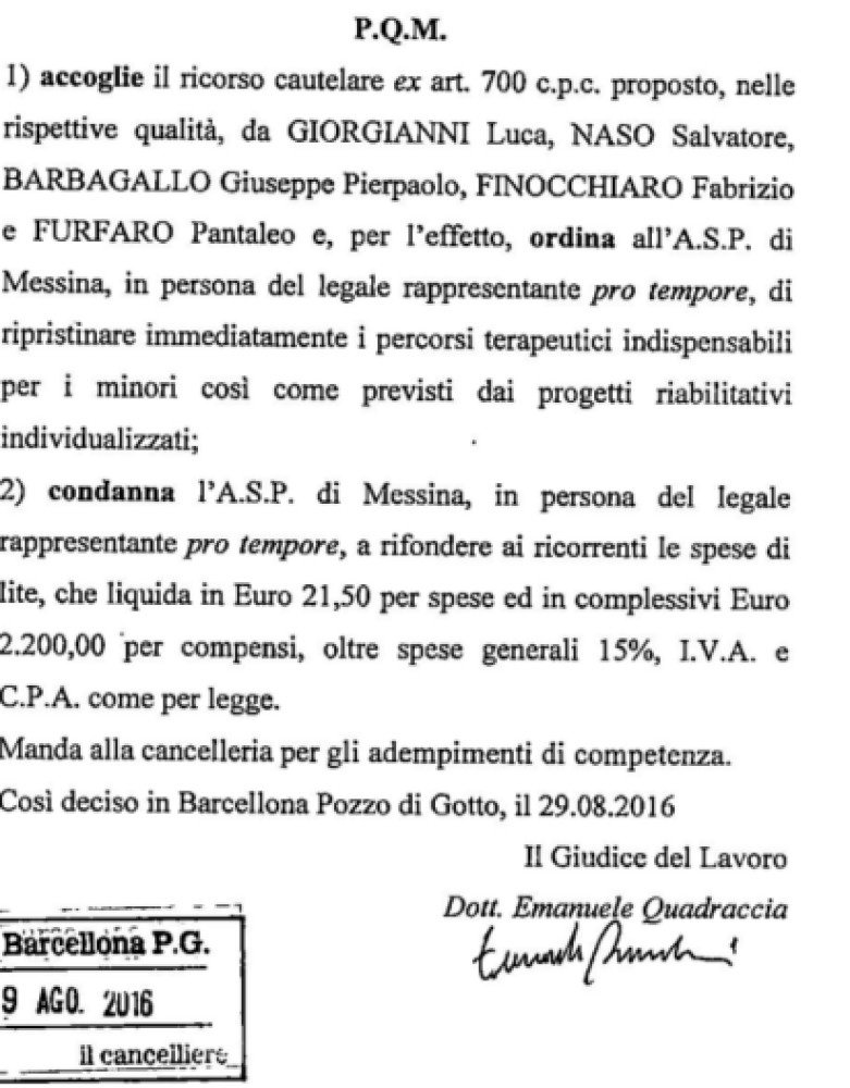 Al Direttore del Dipartimento Riabilitazione ASP 5 Messina Dott. Giuseppe Quattrocchi di revocare con effetto immediato l’autorizzazione ad utilizzare i locali del Centro di Riabilitazione di Canneto per la collocazione della Guardia Medica ed ogni altro servizio che non sia inerente alla riabilitazione. Al signor Procuratore della Repubblica che legge per conoscenza di individuare comportamenti punibili e procedere al fine della salvaguardia dei soggetti più fragili nel rispetto della sentenza emanata dal Suo ufficio e qui allegata.
