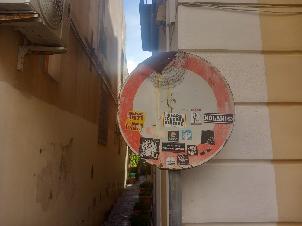 2) Cartello stradale in pieno centro, in via Maurolico dove s'immette nel vicolo lungo.