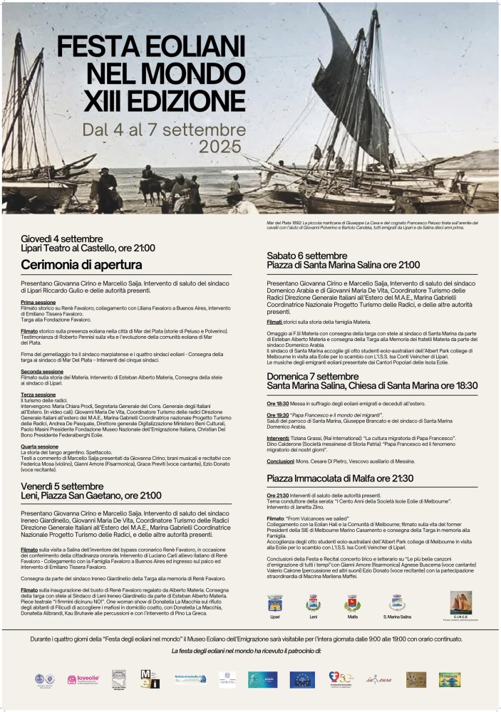 Dal 4 al 7 settembre 2025, le isole di Lipari e Salina, incastonate nel cuore dell’Arcipelago Eoliano in provincia di Messina, si trasformeranno in un palcoscenico internazionale, ricco di significati simbolici e culturali. In questi giorni, le Eolie diverranno centro nevralgico di una straordinaria celebrazione della memoria, dell’identità e dell’appartenenza: La Festa degli Eoliani nel Mondo 2025. Promosso dal professor Marcello Saija – già Cattedratico nelle Università di Catania, Messina e Palermo storico di riconosciuta fama e appassionato custode della storia eoliana – l’evento vedrà il suo momento culminante nella firma ufficiale del Patto di Gemellaggio tra i rappresentanti istituzionali dei Comuni Eoliani e la Città di Mar del Plata, in Argentina. Si tratta di un’alleanza profondamente sentita, che affonda le radici nella grande storia dell’emigrazione eoliana oltreoceano. Un gemellaggio che non è solo formale, ma che intende riaffermare i legami di sangue, di cultura e di affetto che uniscono le due sponde dell’Atlantico.