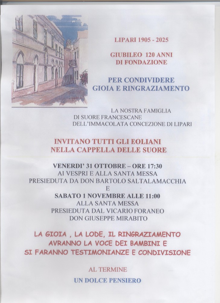 in occasione della Memoria dei 120 anni di fondazione dell'Istituto Suore Francescane dell'Immacolata Concezione di Lipari, sono state programmate le Celebrazioni per il 31 Ottobre e per il 1° Novembre p.v.