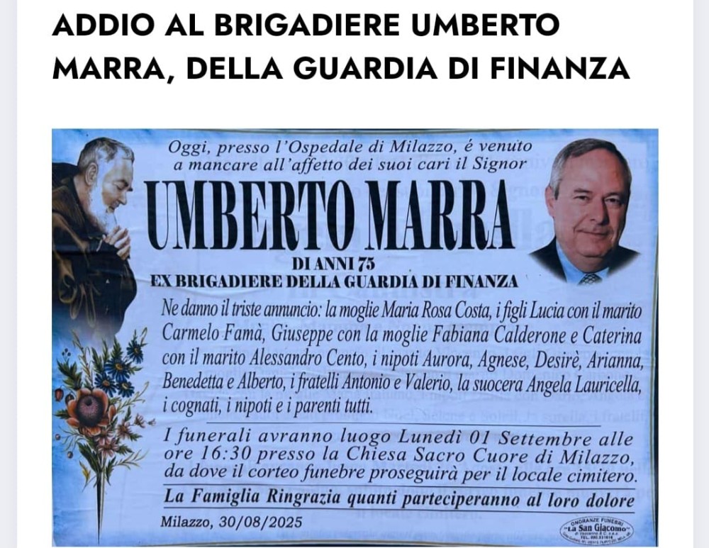 Milazzo, ci lascia Umberto Marra già brigadiere della guardia di finanza in servizio anche alle Isole Eolie.