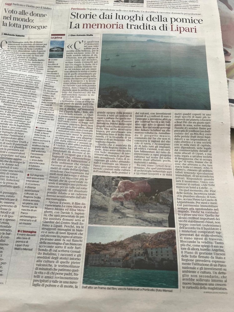 Spezza il cuore, il film documentarioLa cava bianca di Marco Mensa ed Elisa Mereghetti, con Davide S. Sapienza, che sarà presentato in prima assoluta domani sera ai Giardini del Centro Studi Eoliano a Lipari. Perché, tra le struggenti immagini in bianco e nero di tanti liparoti che col piccone in pugno si arrampicavano anni fa sui fianchi della montagna d’un biancore accecante sotto il sole furibondo di cui scriveva Gesualdo Bufalino, i racconti e gli aneddoti degli storici intorno alla cultura di quelle pietre vulcaniche, le testimonianze di minatori che patirono quella vita o di chi perse padri, fratelli o amici rovinosamente precipitati a valle in una nuvolaglia di polvere e di morte, la grande epopea della pomice ricorda a tutti gli uomini di cuore e cultura che quella memoria non merita d’essere buttata via. Perché dietro ogni singolo solco rigato a prezzo della vita nella montagna bianca, per parafrasare una bellissima frase di Indro Montanelli, c’è la biografia di un nonno e di un bisnonno. Che vogliono rispetto.